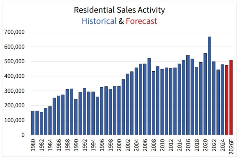 In 2026, national home sales are forecast to rebound by 7.7% to 509,479—the highest level for activity since 2021, though still well below that peak and slightly under the 10-year average. Historically, national home sales have only ever cracked the half million mark seven times, with the first instance back in 2007.