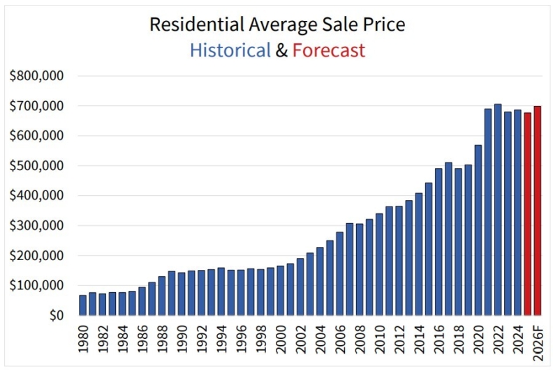 The national average home price is forecast to increase by 3.2% from 2025 to $698,622 in 2026. This would mark the sixth straight year where the national average home price has hovered around the $700,000 range.