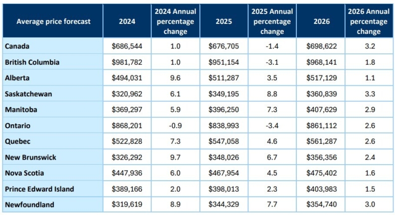 The national average home price is forecast to decline by 1.4% on an annual basis to $676,705 in 2025. That said, only British Columbia and Ontario are forecast to see declines in average home prices this year, but the combination of those declines, along with fewer sales in those expensive provinces was enough to offset price gains in the range of 4% to 8% in most other provinces in 2025.