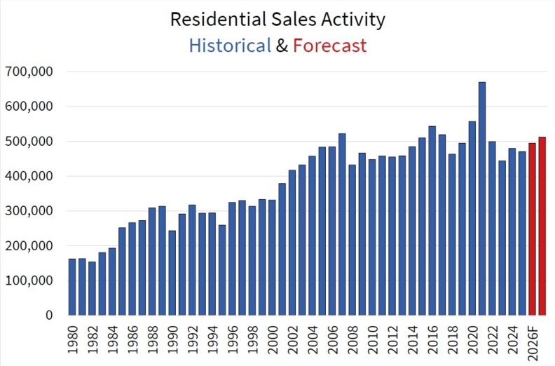 Some 494,512 residential properties are forecast to trade hands via Canadian MLS® Systems in 2026, representing an increase of 5.1% from 2025. As previously forecast, the national gain is still expected to be driven largely by British Columbia and Ontario where sales have much more room to recover. Activity in B.C. and Ontario is forecast to rise by more than 8% in 2026, with gains of less than half that in most other provinces where sales are already running at higher levels and where supply is far more constrained.